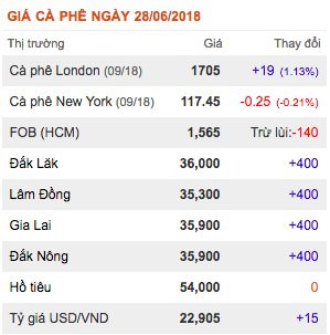 Như vậy sau 2 phiên giao dịch, giá cà phê nội địa đã hồi phục dần sau khi giảm sâu tới 1.000 đồng/kg trong ngày 26/6. Nguyên nhân giá cà phê tăng trở lại là do giá cà phê robusta trên sàn kì hạn tăng trưởng khá. Theo đó, chốt phiên giao dịch đêm qua, giá cà phê kì hạn giao tháng 9/2018 tại thị trường London tăng 19 USD/tấn, đạt 1.705 USD/tấn, tương đương 1,13%. Đáng chú ý, kì hạn giao hàng tháng 7 tăng tới 37 USD/tấn, đạt mức 1.733 USD/tấn.